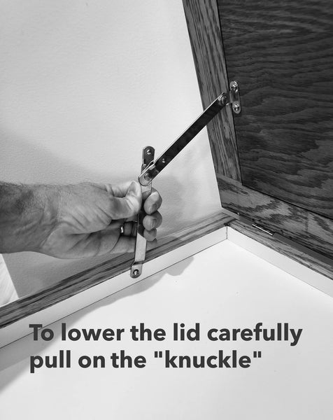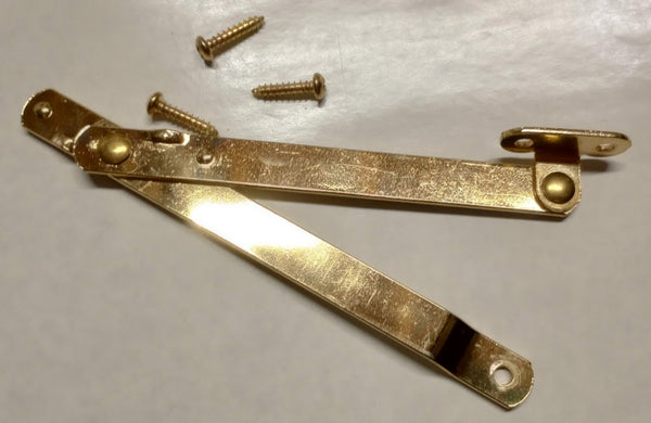 Brass plated with screws, this support holds lid open at 90 degrees.  Overall length is approximately 10-1/2". Pivot design allows support to be used with only a minimal 1-1/4" depth. The minimum front to back lid distance is 14".  Lid weight 10 pounds maximum.