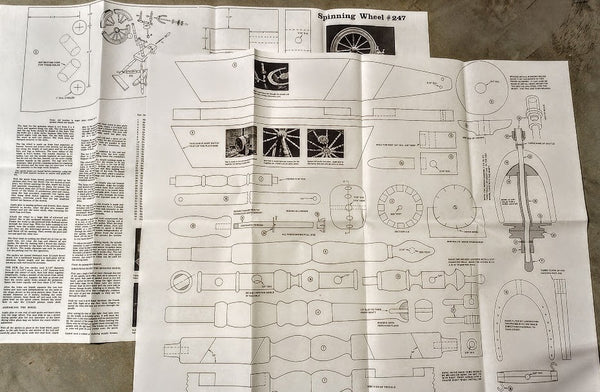 Spinning Wheel Plan... Our plan to build a spinning wheel is strictly for the wood-spinner, Though wool spinners seem to love the end result. This working spinning wheel demands a lot of detailed lathe work to build. The big wheel must glued up in 4 sections and turned on the outer face plate. A wood lathe project for the ultimate wood turner. The main wheel measures 22" diameter. Overall size 22" x 30" x 38". Printed full size plan is 2 pages, each page 22" x 28".