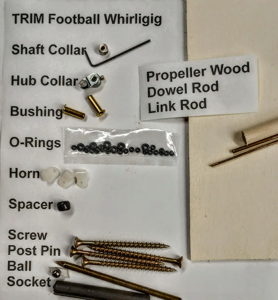 • (Trim packs are specific to each plan design. We illustrate a typical trim pack here). Generally the trim pack will have 1/8" birch ply to form the propellers, brass rod to form linkage, appropriate O rings, shaft collar/key and hub collar bracket to secure the main linkage,required eyelets,brackets,screw eyes etc. dependent upon the particular project.